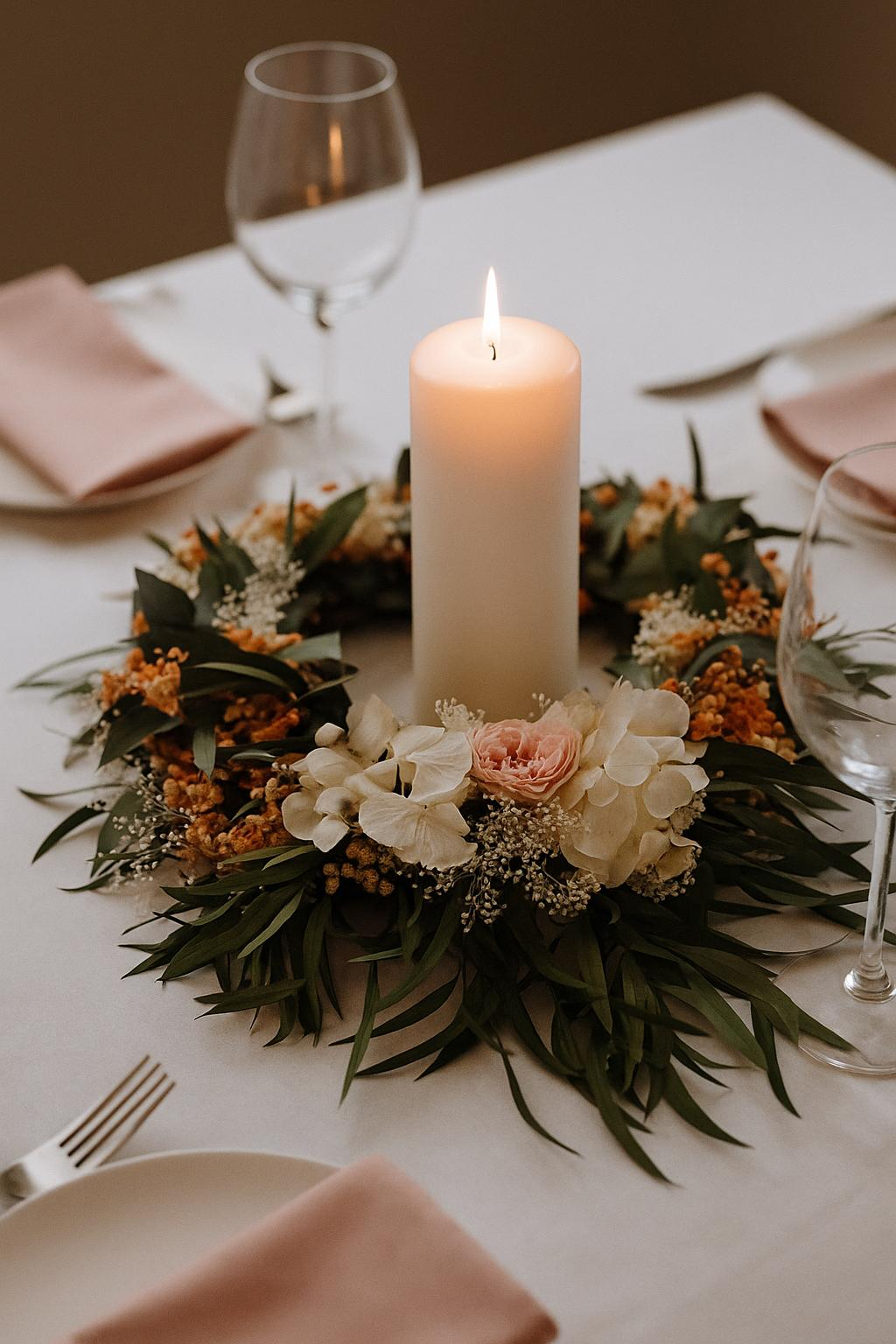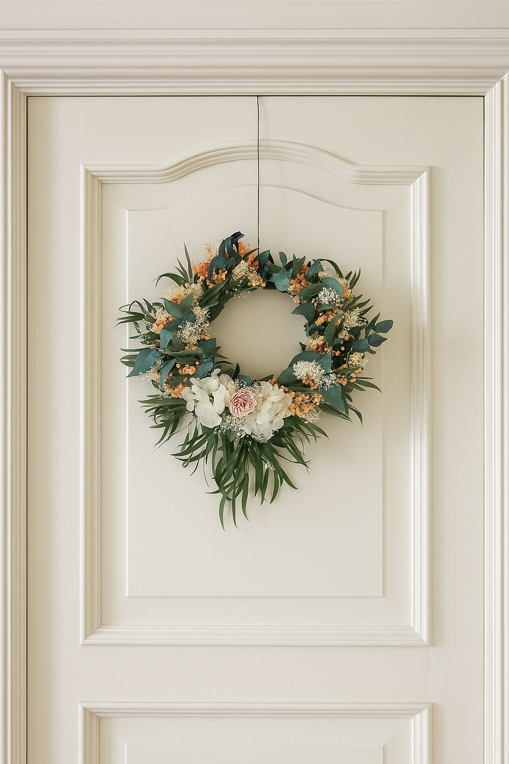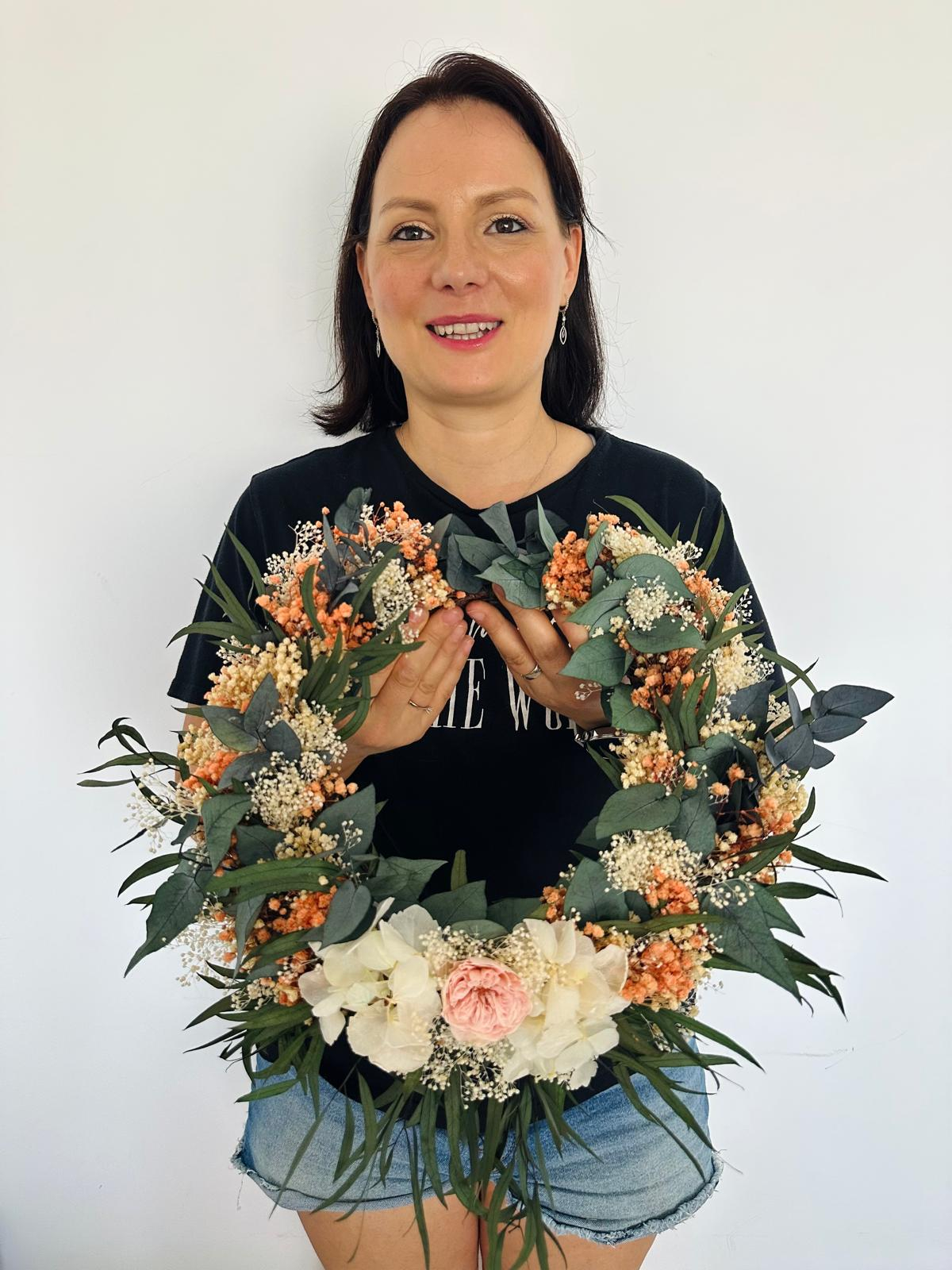 Este o creatie handmade, 100% naturala. Contine un trandafir criogenat delicat, hortensie criogenata si plante naturale stabilizate. , toate prinse pe un suport de coroana.