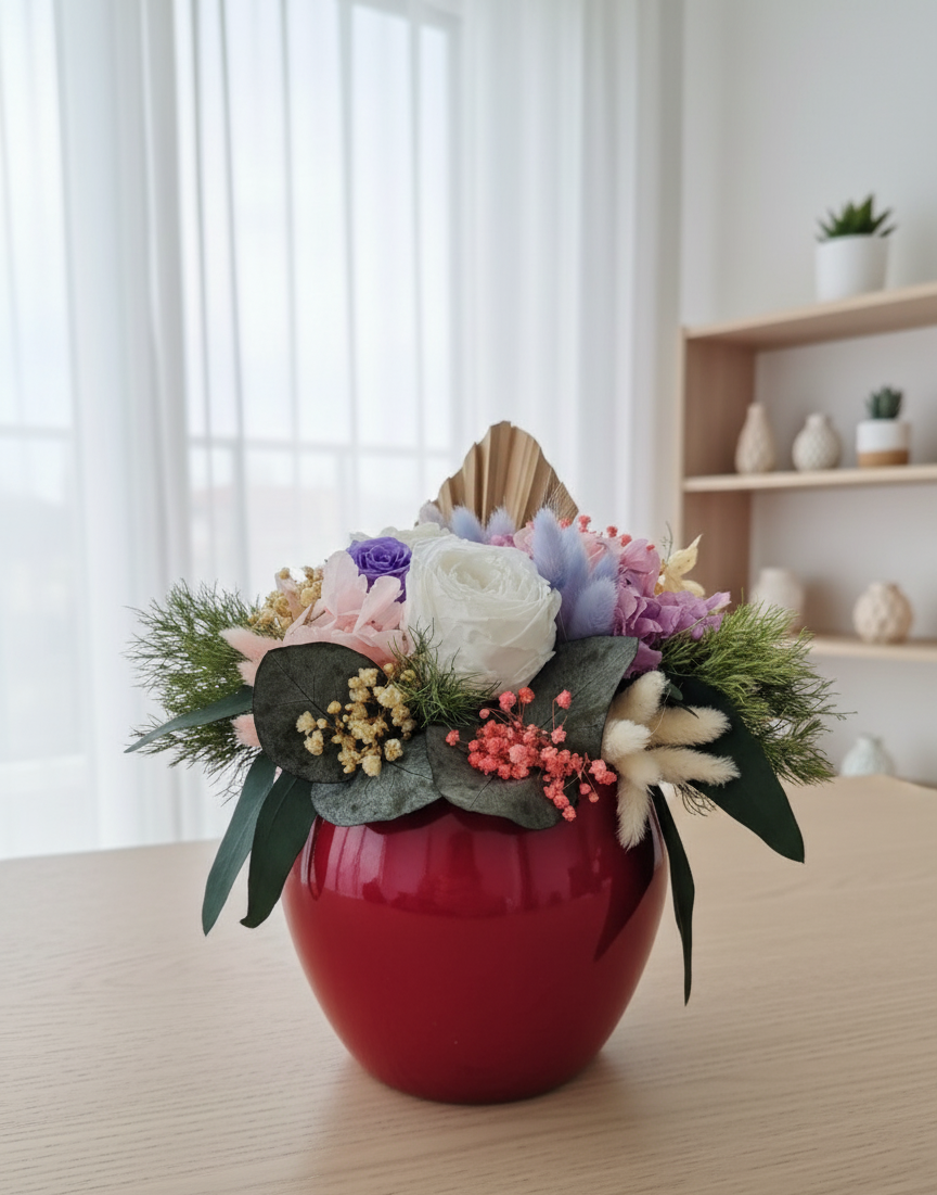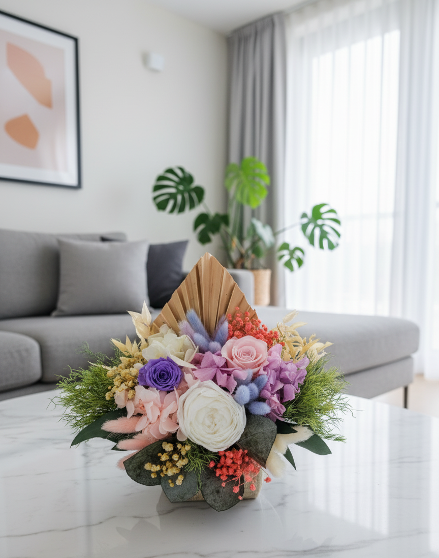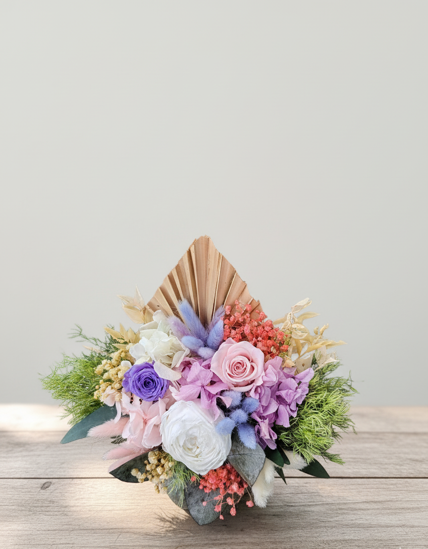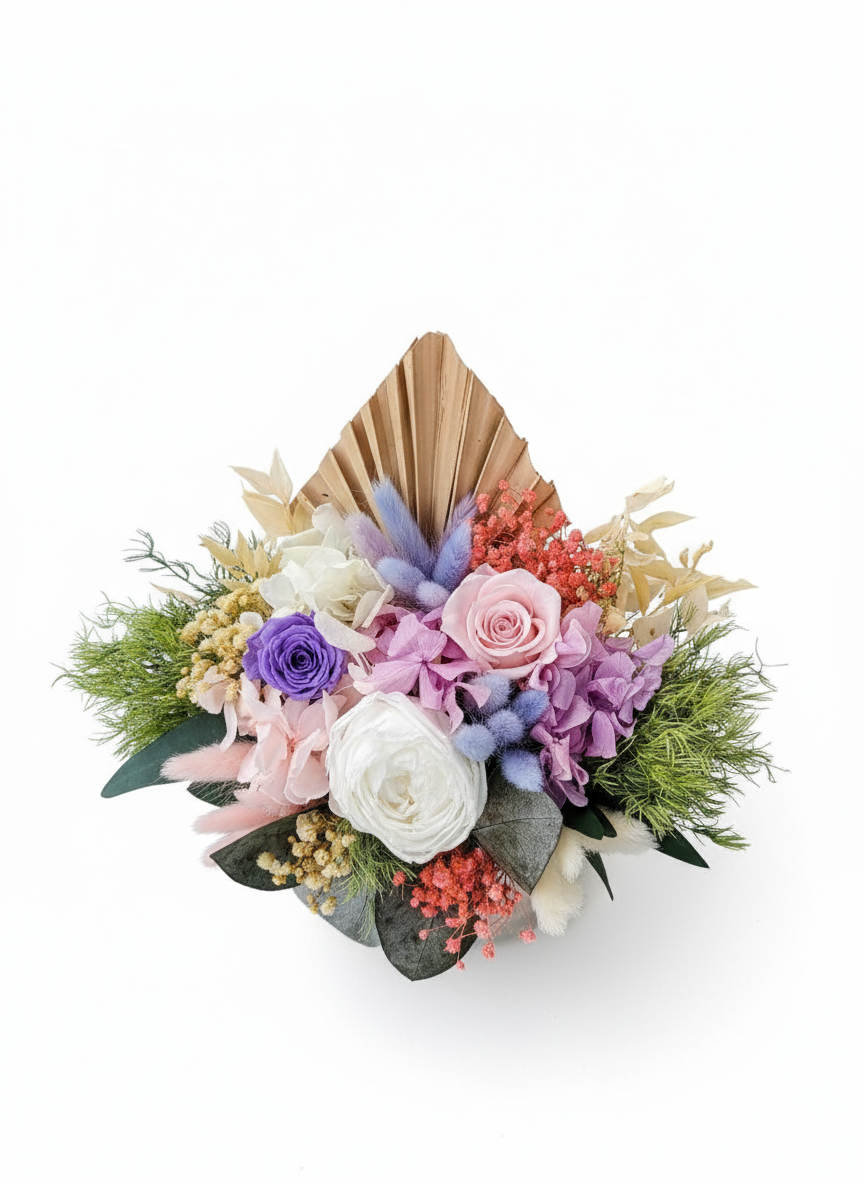 Designul imbina perfect delicatetea florilor criogenate cu accentele indraznete ale stilului boho. Inima aranjamentului este o simfonie de trandafiri naturali criogenati in nuante de lila, roz pastel si un alb pur. Elementul de rezistenta este frunza de palmier, care adauga o nota exotica si o structura arhitecturala moderna. Baza bogata de hortensie criogenata, lagurus si plante naturale stabilizate completeaza un tablou texturat si plin de farmec.
