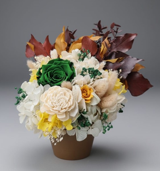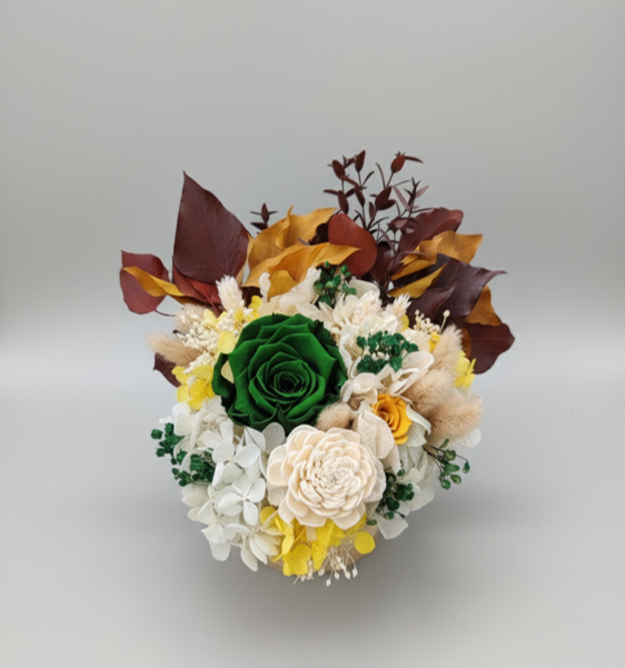 Este o creatie 100% naturala. Contine un trandafir criogenat verde smarald, o floare de sola alba/crem, trandafir galben, hortensie si frunze naturale stabilizate, toate asezate intr-un vas ceramic auriu.