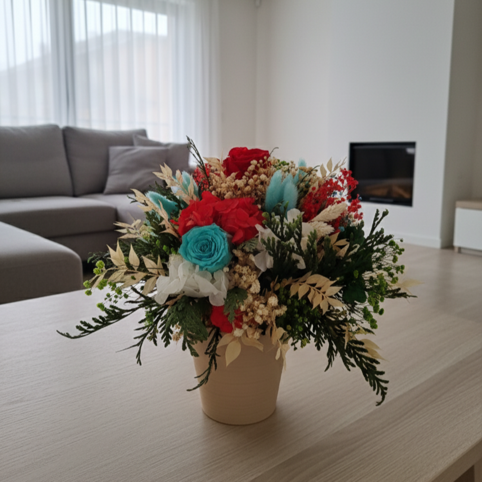 Compoziție: Trandafiri criogenați (Roșu, Alb, Turcoaz), hortensie și mix de plante naturale stabilizate.