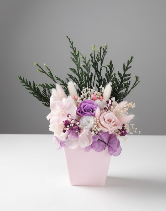 Este o creatie naturala. Contine un trio de trandafiri naturali criogenati (mov lavanda, roz prafuit, alb), hortensie criogenata, lagurus si alte plante naturale stabilizate, toate asezate intr-un vas ceramic roz.