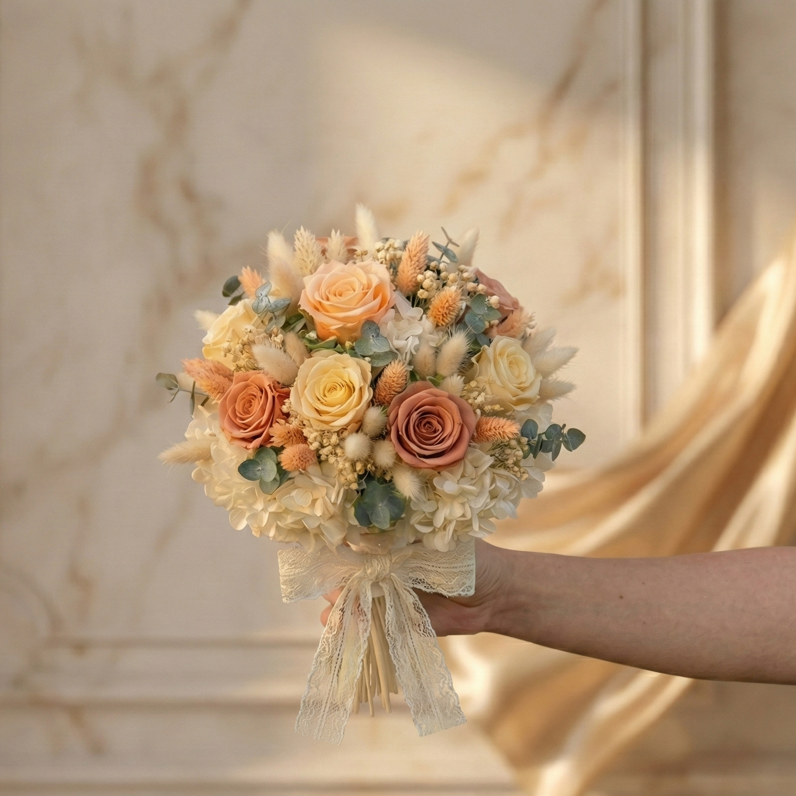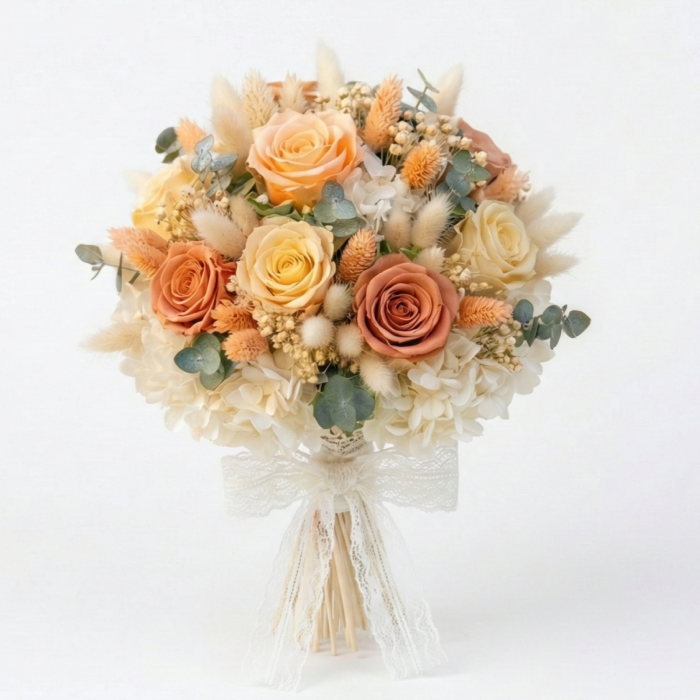 Imaginează-ți emoția unică a momentului în care pășești spre altar, înconjurată de o armonie vizuală caldă, care îți completează perfect ținuta. Buchetul „Armonia” este o simfonie cromatică delicată, creată pentru a captura esența feminității și a bucuriei pure.