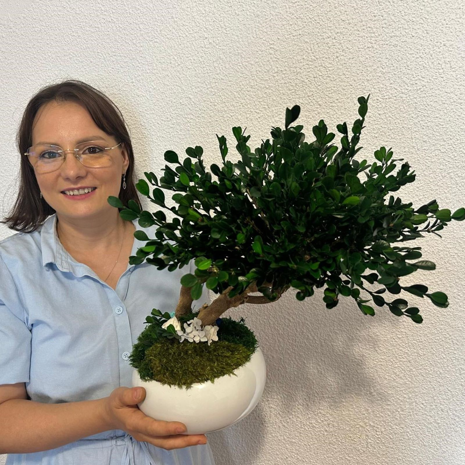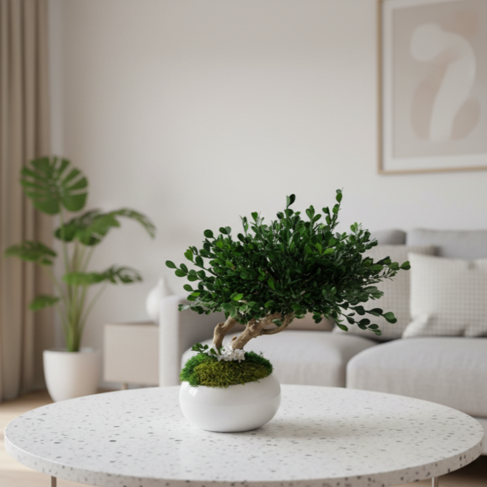 Coroana bogată este realizată din frunziș natural stabilizat, de un verde profund, iar baza este acoperită cu mușchi natural stabilizat. Întreaga compoziție este așezată într-un vas ceramic alb, lucios, cu un design minimalist care completează perfect orice interior.