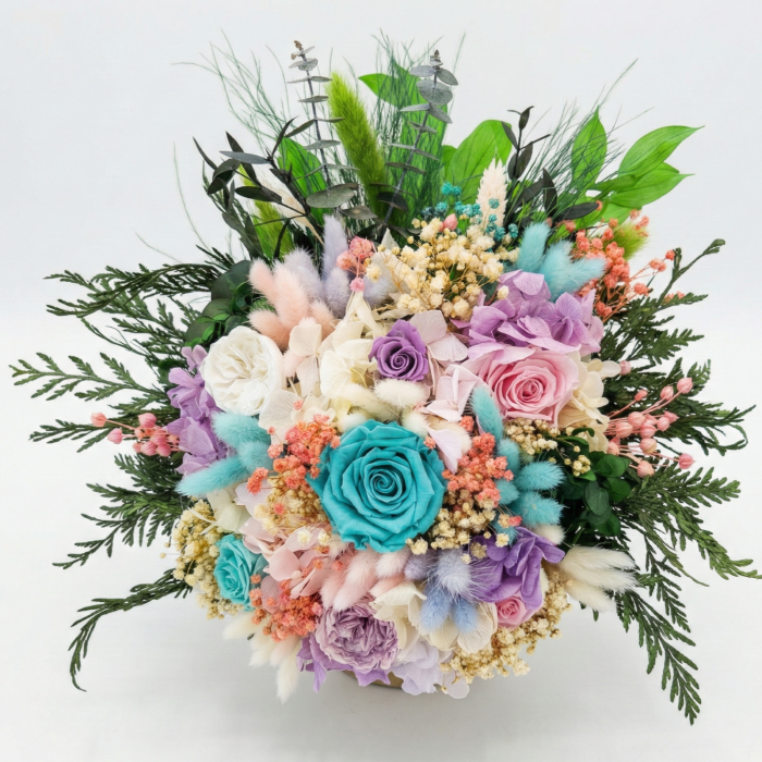 Compoziție: Trandafiri criogenați (Turcoaz, Mov, Roz, Alb), hortensie, gipsofila, lagurus și plante stabilizate.