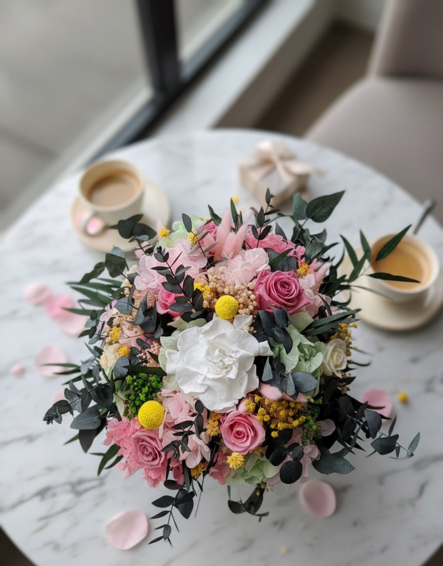 Acest aranjament cu flori criogenate si plante stabilizate nu necesita absolut nicio ingrijire. Nu se uda si trebuie ferit de lumina directa a soarelui, nu se tine langa o sursa de caldura sau langa aer conditionat si umiditarea recomandata este 45%- 75%.