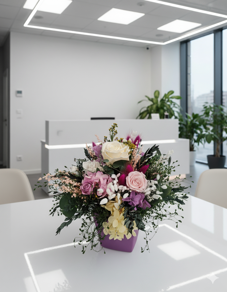 Inima aranjamentului este formata din trandafiri naturali criogenati, unul de un alb-crem pur si altul de un roz pastel delicat. Acestia sunt invaluiti de o compozitie bogata de hortensii criogenate in nuante de lila si roz, si de accente vibrante fuchsia, care adauga o nota de personalitate. Baza din plante naturale stabilizate completeaza un tablou plin de farmec si rafinament, asezat intr-un vas ceramic lila.