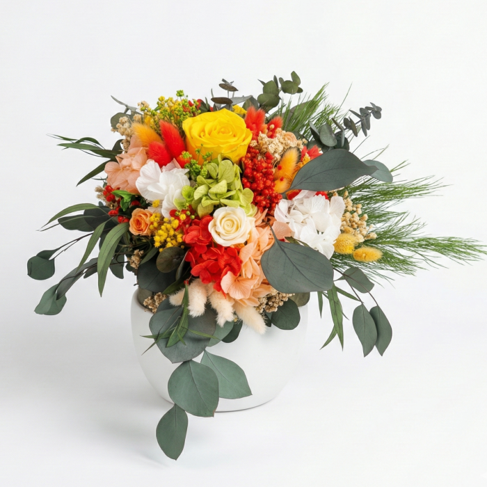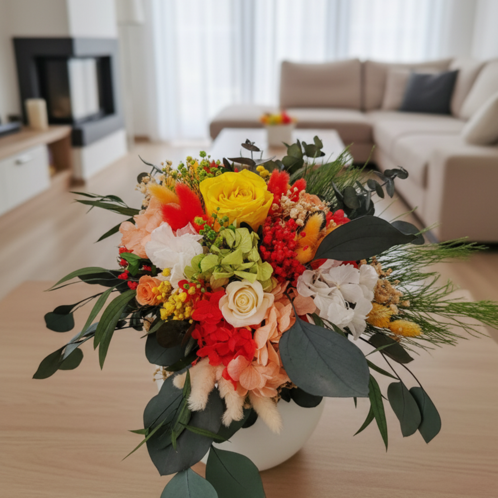 Tip Produs:: Aranjament floral vibrant, ideal pentru decorarea meselor de cafea, a livingurilor moderne, recepțiilor office sau a spațiilor HoReCa (cafenele, restaurante).