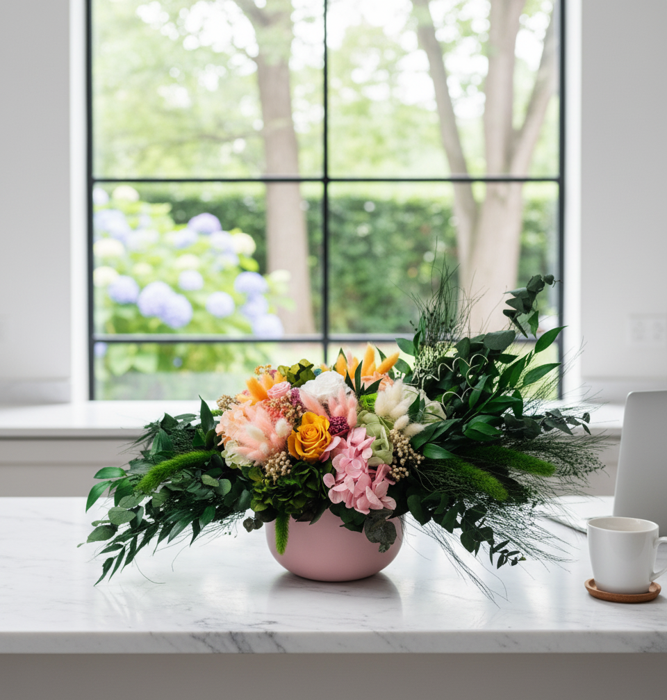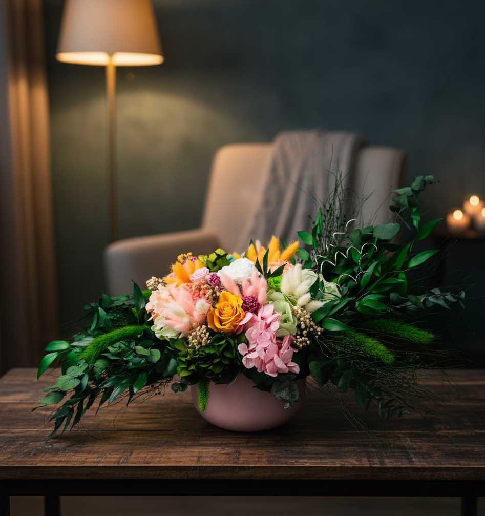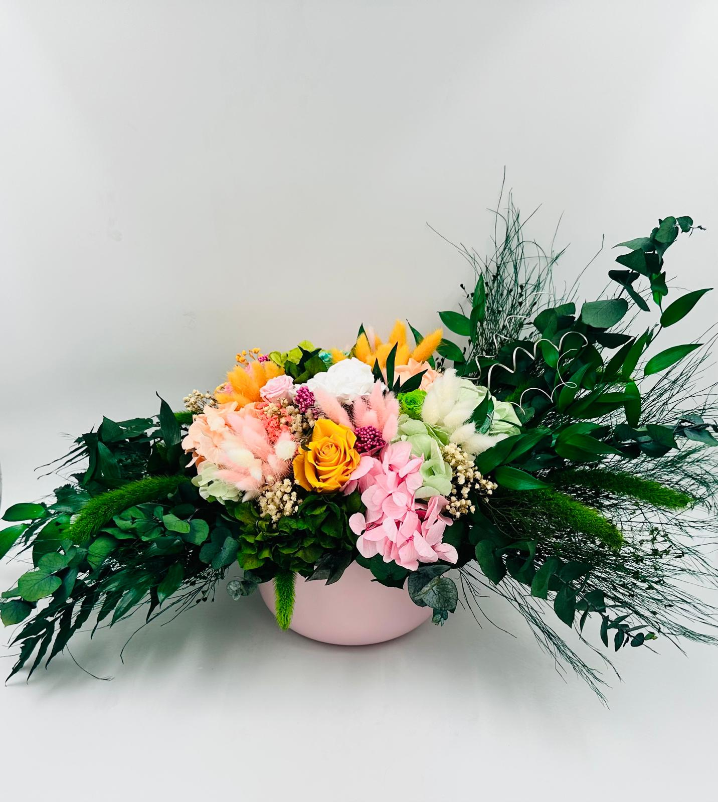 Este o creatie 100% naturala. Contine un mix bogat de trandafiri criogenati (roz, alb, verde galben), hortensie criogenata si o varietate de plante naturale stabilizate (eucalipt,feriga), toate asezate intr-un vas ceramic roz.