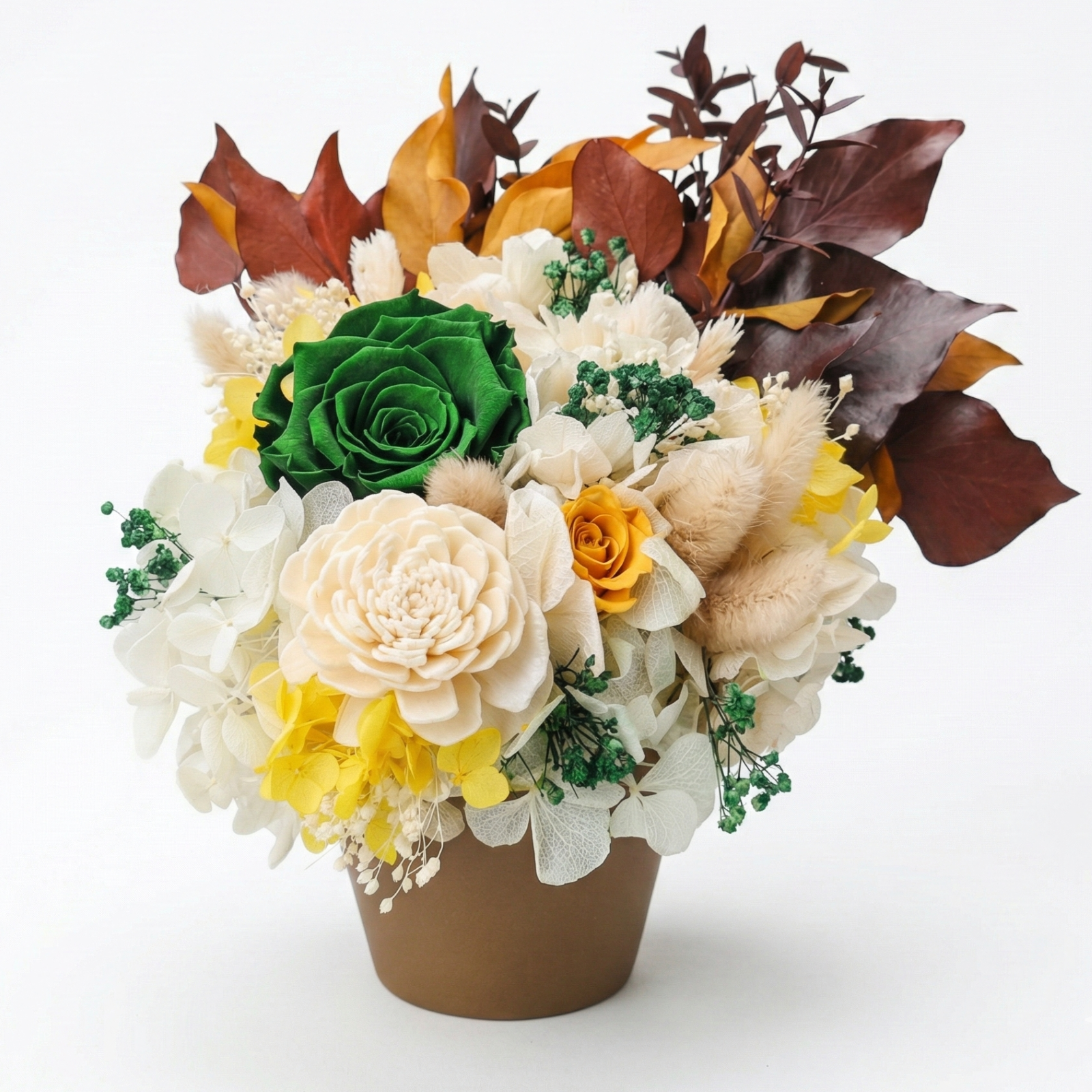 Este o creatie 100% naturala. Contine un trandafir criogenat verde smarald, o floare de sola alba/crem, trandafir galben, hortensie si frunze naturale stabilizate, toate asezate intr-un vas ceramic auriu.
