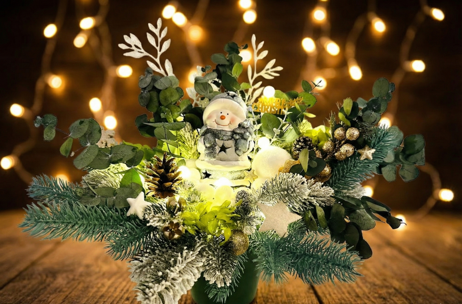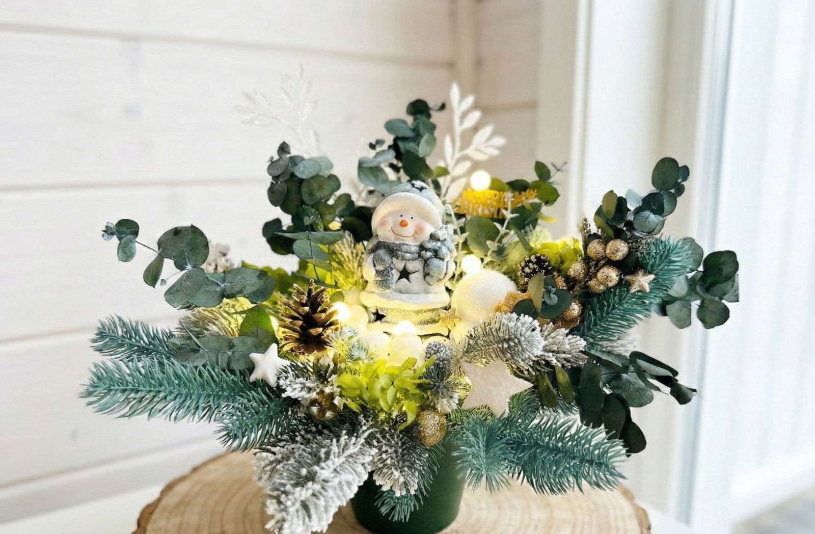 Folosim un mix de elemente: eucaliptul este natural stabilizat, iar crengutele de brad sunt artificiale de inalta calitate (unele cu aspect nins), pentru ca aranjamentul sa reziste perfect an de an.