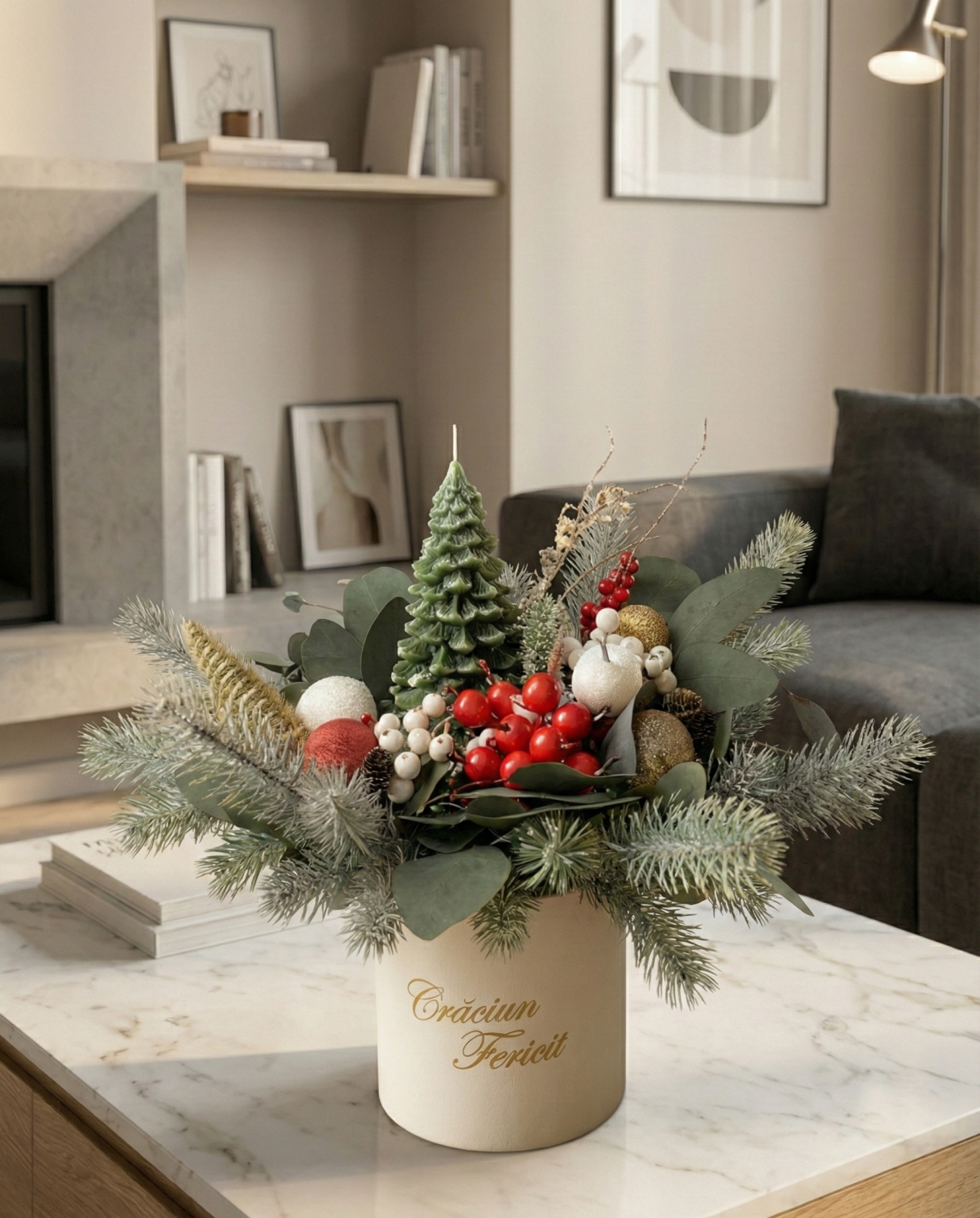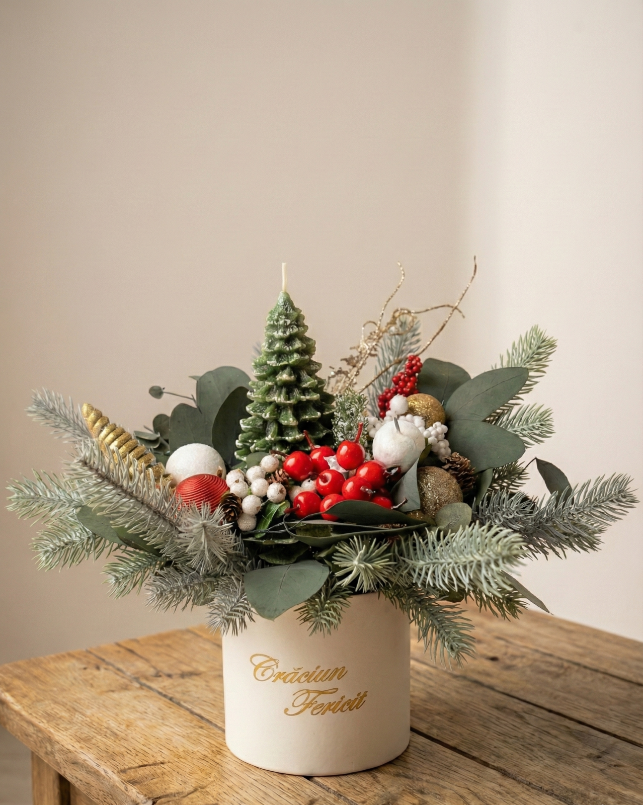 Textul "Craciun Fericit" este imprimat pe cutie si face parte din farmecul acestui aranjament, fiind gandit special ca un cadou care transmite o urare.