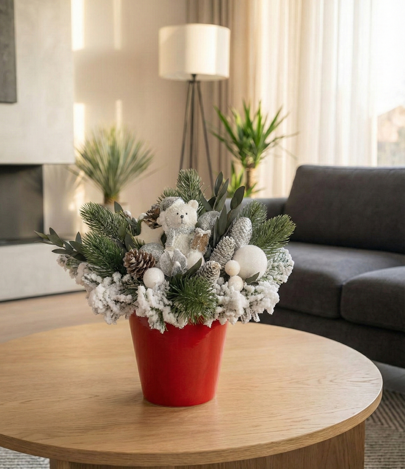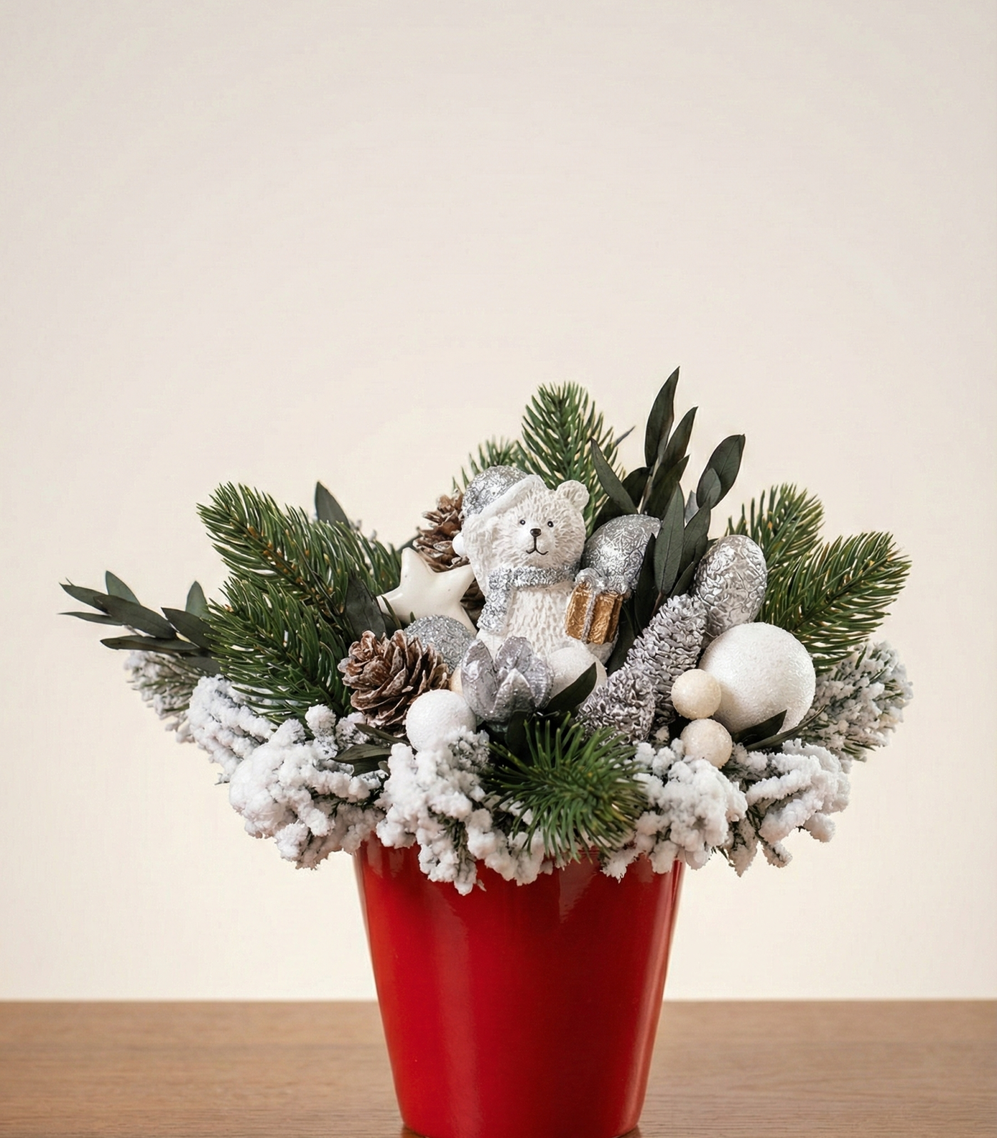 Figurina ursulet este o decoratiune rigida, pictata cu detalii fine si accente sclipitoare. Desi arata foarte simpatic, nu este o jucarie de plus moale, ci o piesa de colectie integrata in aranjament.