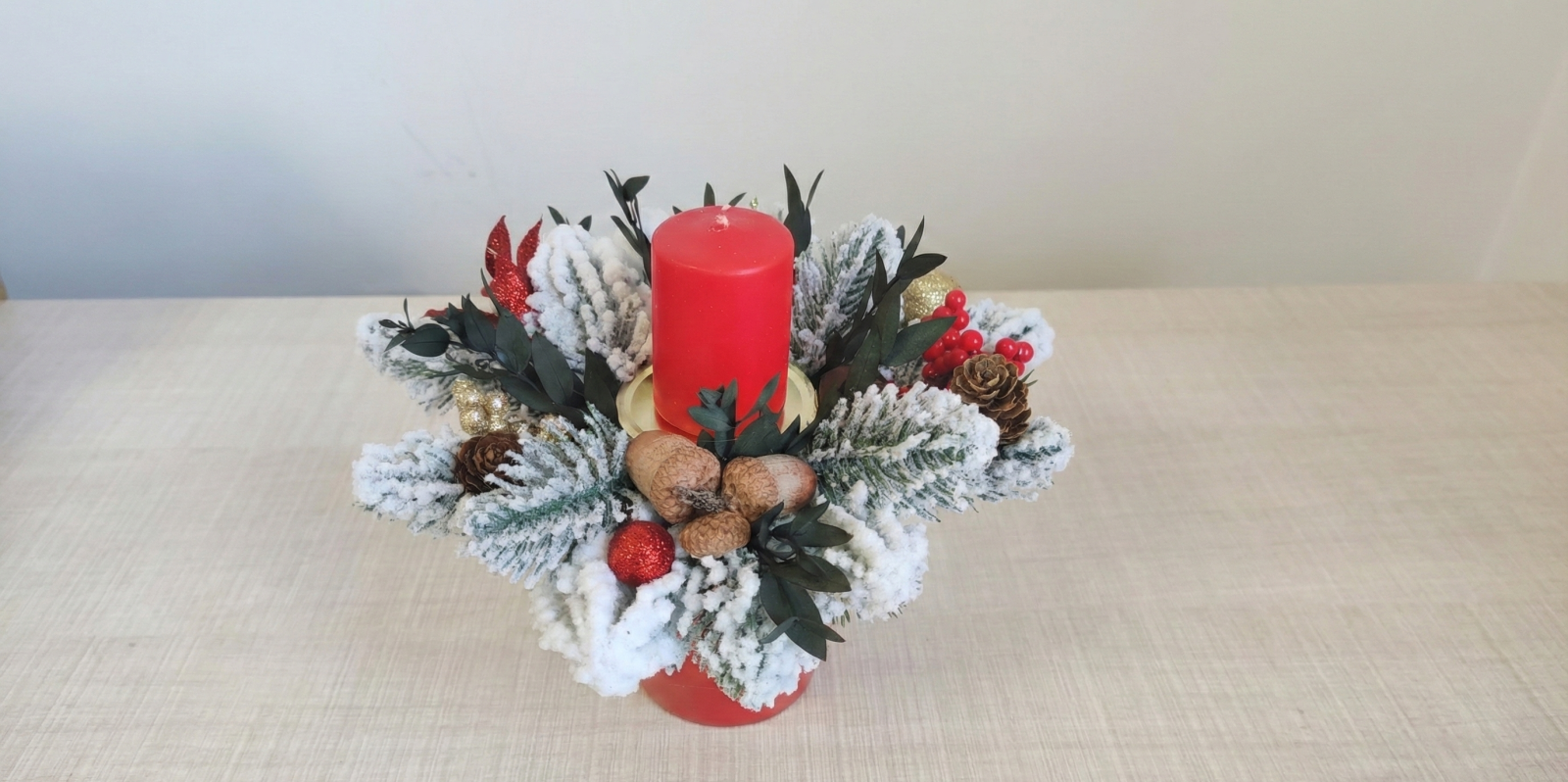 Lumanarea este functionala si creaza o atmosfera superba. Totusi, recomandam sa nu o lasati nesupravegheata si sa o stingeti inainte ca flacara sa ajunga la nivelul elementelor decorative (crengute, globuri) pentru a evita orice risc.