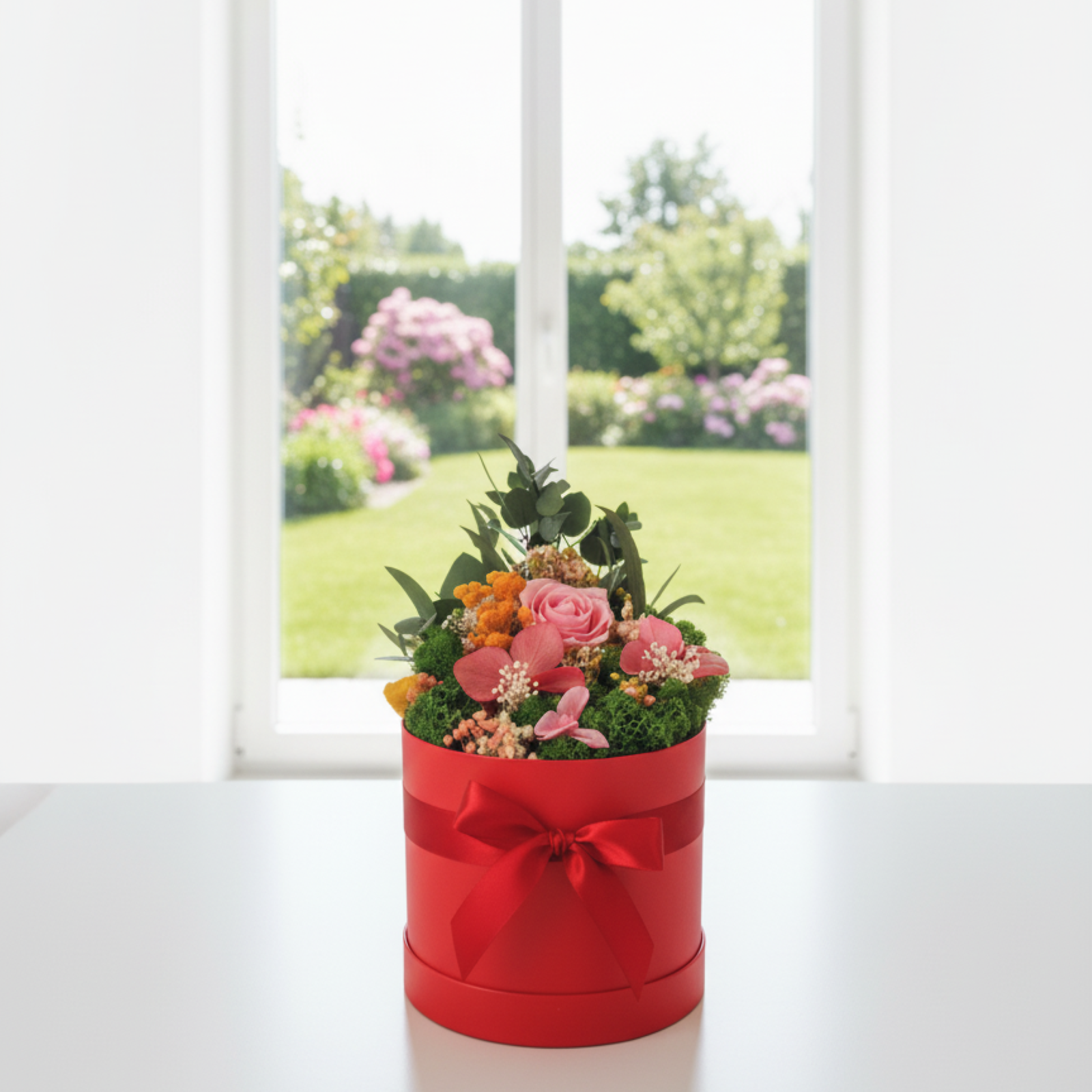 Este o creatie 100% naturala. Contine un trandafir criogenat roz, hortensie,eucalipt si un pat de muschi natural stabilizat, toate asezate intr-o cutie rosie eleganta.