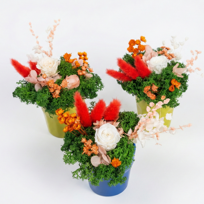 Pentru a vă bucura de culorile vibrante ani la rând, vă recomandăm să plasați aranjamentul într-un loc ferit de razele directe ale soarelui și de umiditate excesivă. Nu este recomandată așezarea lui în baie, bucătărie sau pe pervazul exterior al ferestrei.