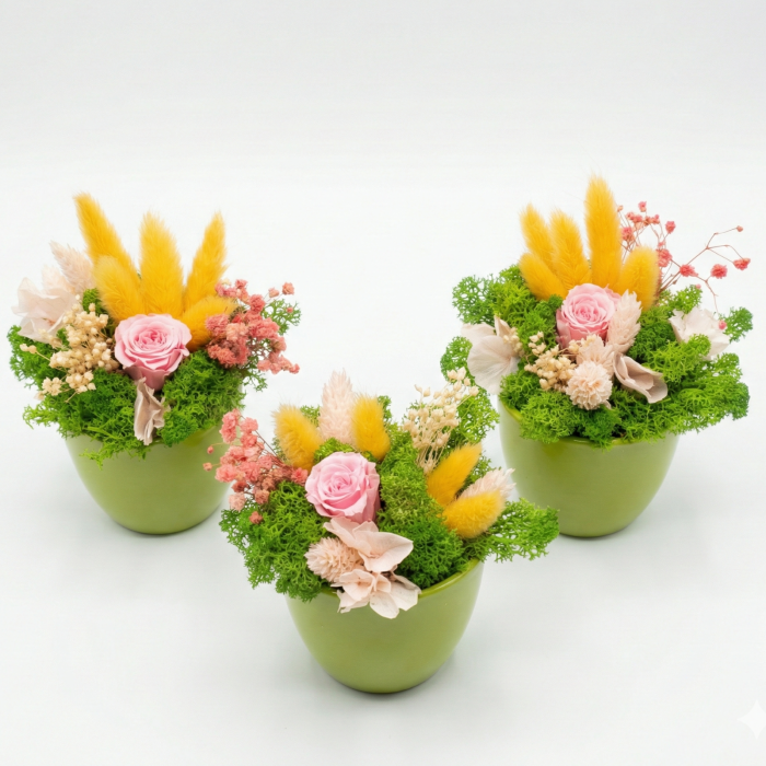 Fiecare aranjament este unicat, fiind creat manual cu pasiune și atenție la detalii de către echipa Atelierul Creative Harmony.
