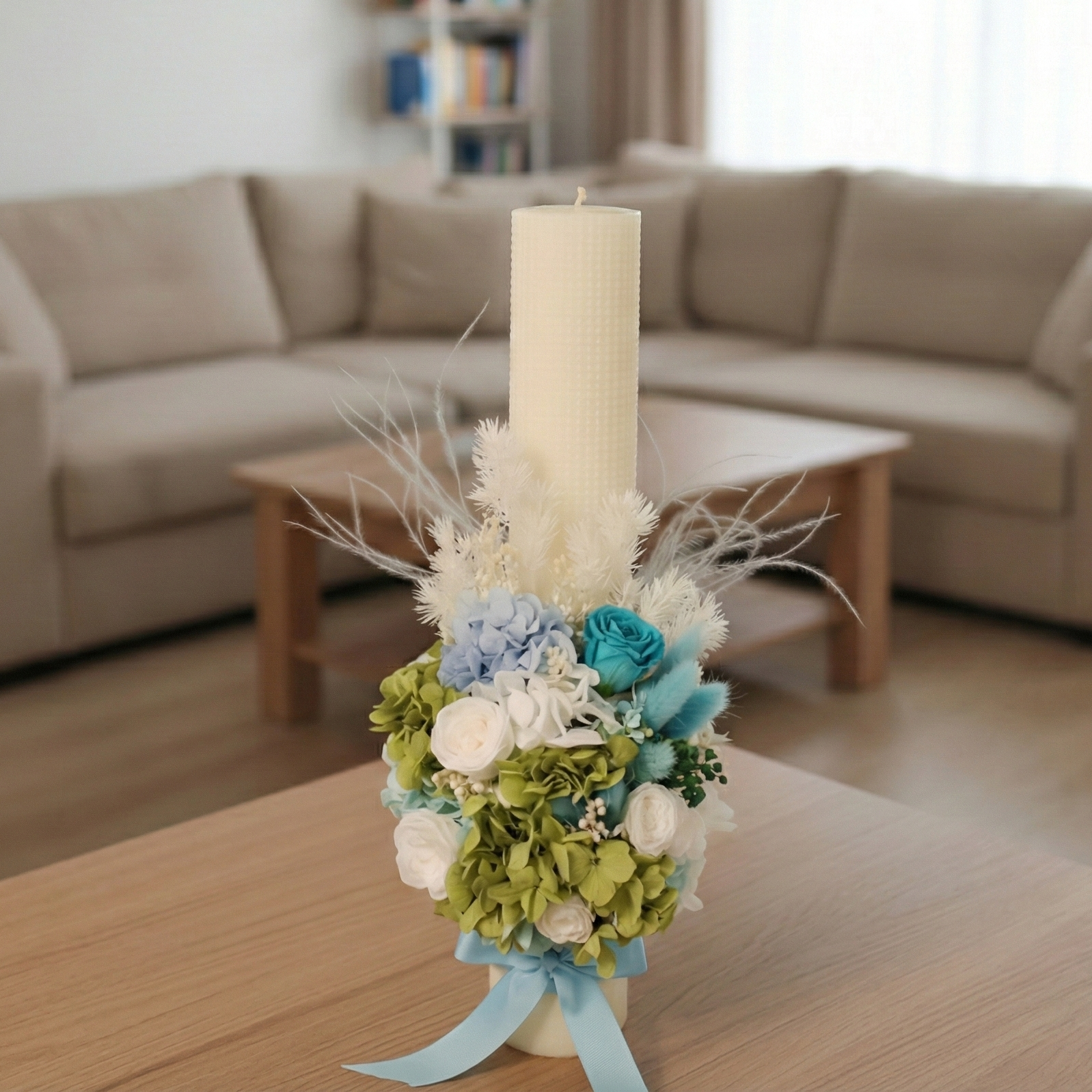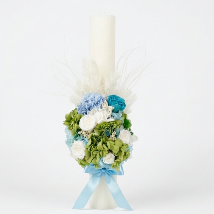 Realizata pe o lumanare alba, groasa, de cea mai buna calitate, piesa de rezistenta este aranjamentul floral de la baza. Acesta este un buchet nemuritor, compus din flori 100% naturale criogenate si plante stabilizate. Am combinat hortensia verde-menta si albastra cu trandafiri delicati albi si un trandafir turcoaz spectaculos, simbol al serenitatii. Accentele fine si pufoase adauga o nota de delicatete eterica, iar funda din satin albastru completeaza perfect designul.