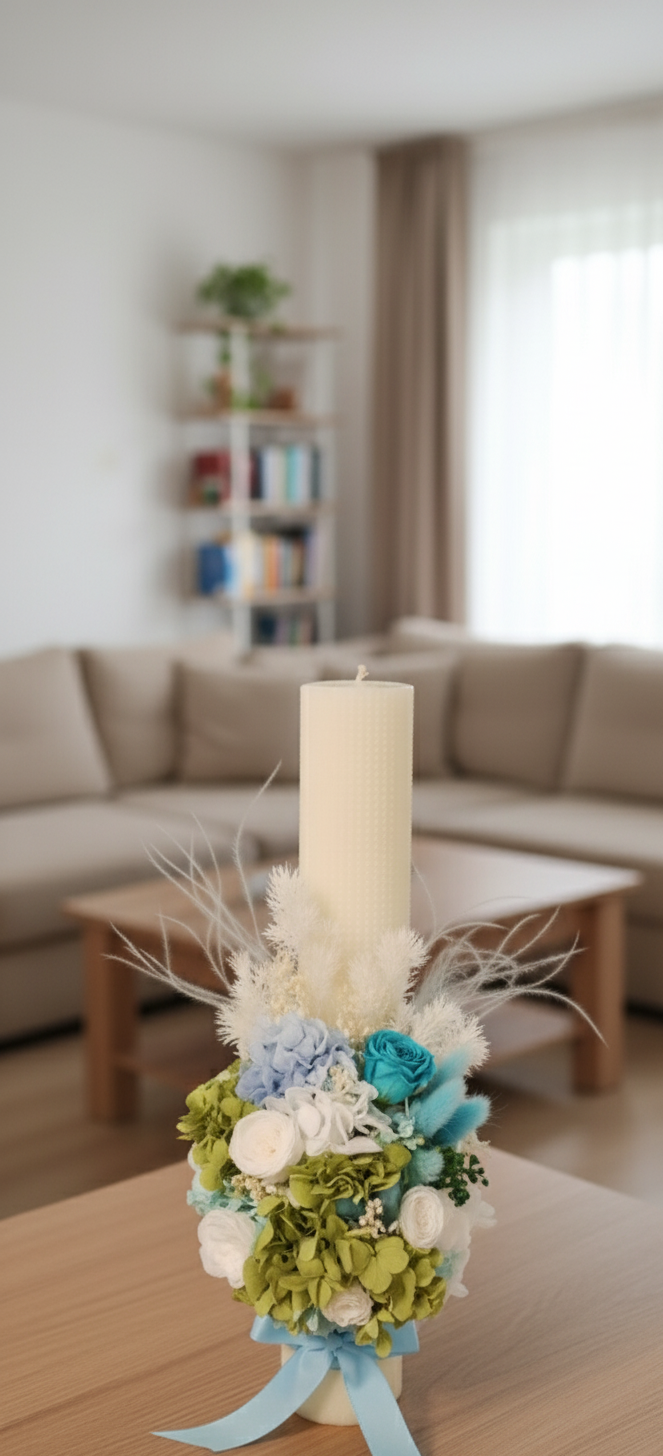 Lumanare din ceara naturala de inalta calitate, trandafiri naturali criogenati (alb, turcoaz), hortensie naturala criogenata (verde, blue, alb, turcoaz)