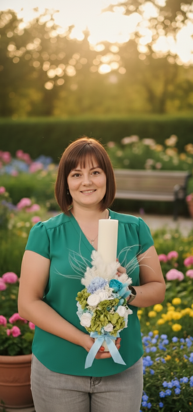 CALITATE PREMIUM, LUCRATA MANUAL: Fiecare lumanare este asamblata manual de designerii nostri florali, cu atentie la fiecare detaliu, garantand un produs cu adevarat special si unic, dimensiunile pot avea mici variatii, un detaliu ce confirma autenticitatea fiecarei creatii.