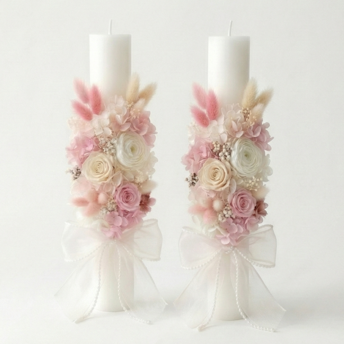 Stim ca trebuie tinute mult timp in mana, asa ca avem grija sa echilibram greutatea aranjamentului floral. Folosim lumanari de calitate, structura florala este realizata sa fie cat mai usoara si comoda pentru nasi.